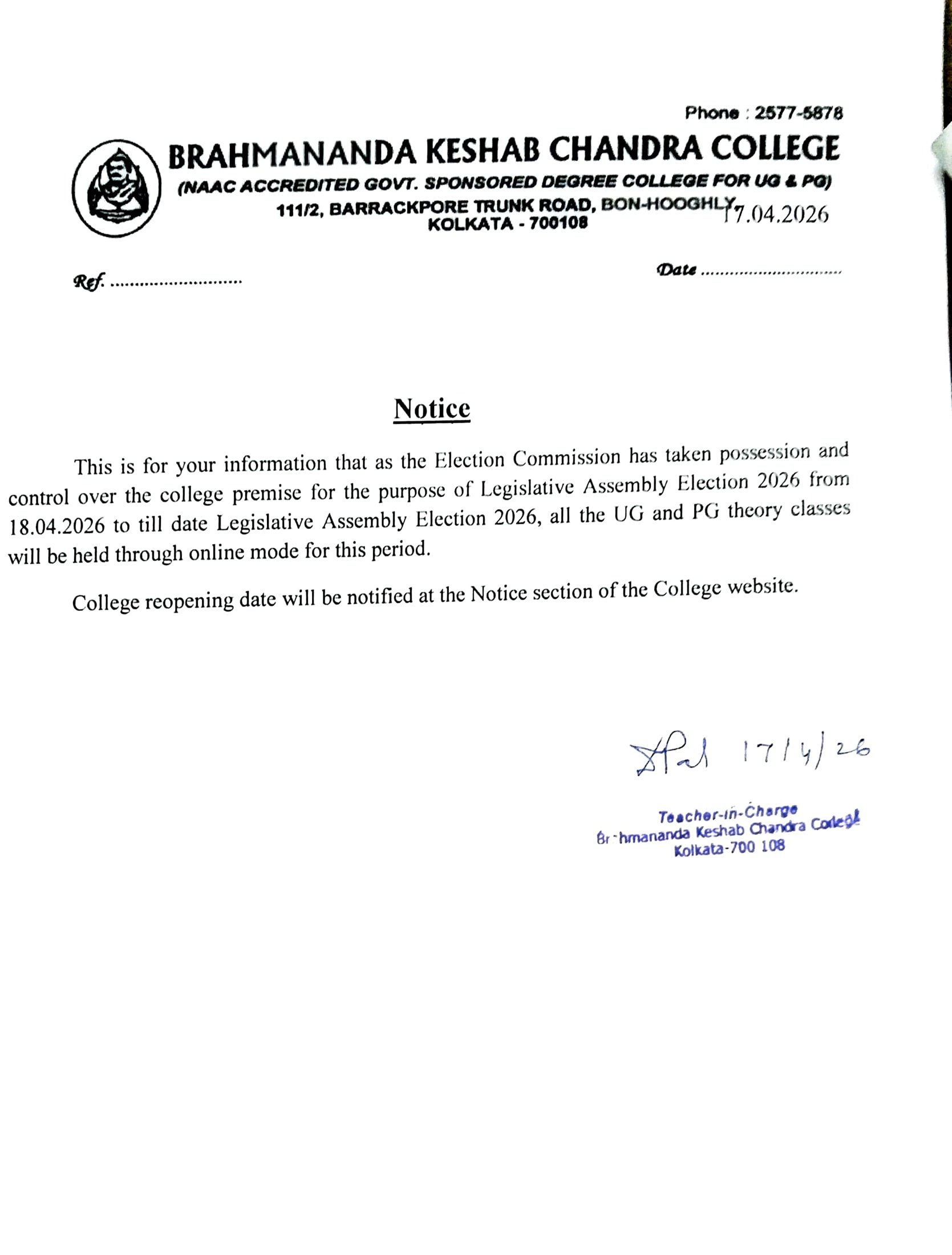 News : Notice of online class (UG & PG) due to closure of college premises for Election purposes from 18.04.2026