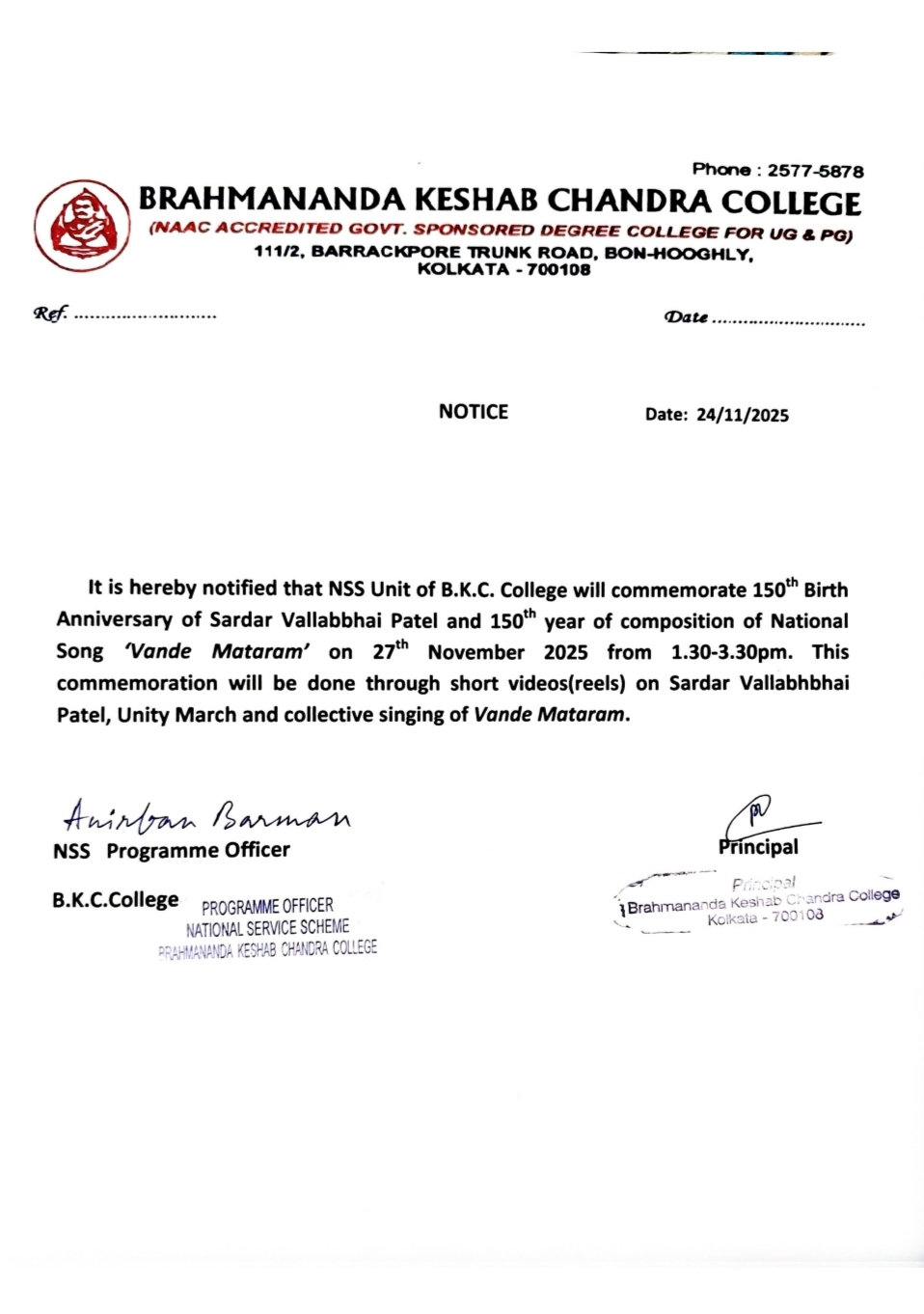 News : Notice for commemorating 150th Birth Anniversary of Sardar Vallabhbhai Patel and 150th Year of Composition of National Song "Vande Mataram" on 27th November 2025