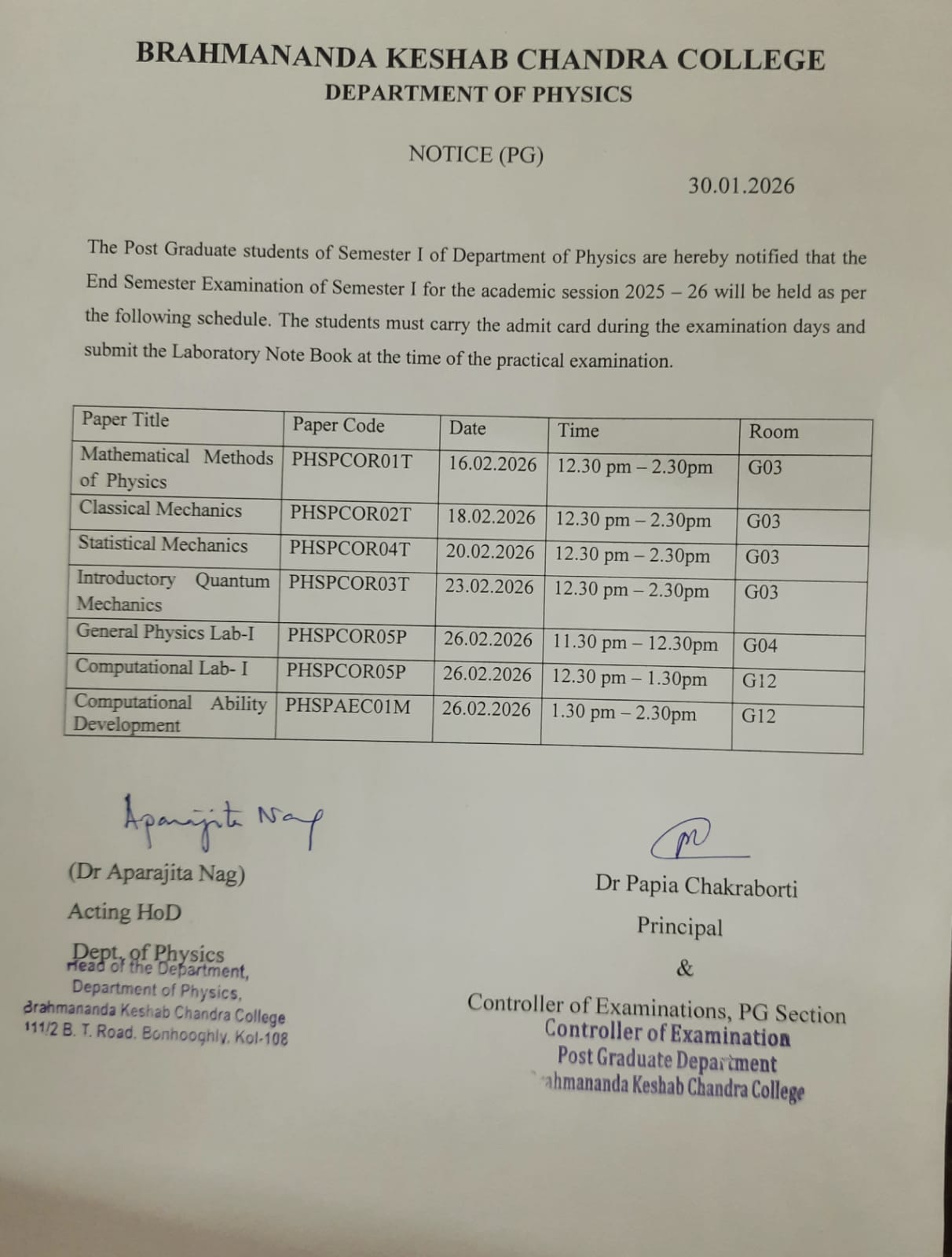 News : Schedule of M.Sc. (Physics) Semester-I End Term Examination 2025-26