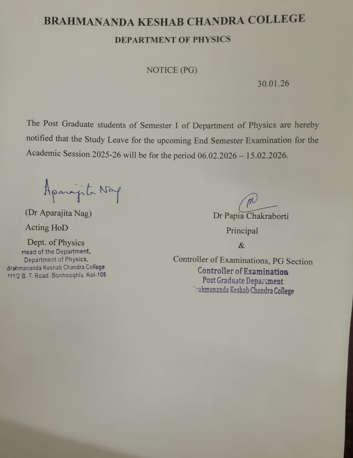 News : Notice regarding Study Leave for PG (Physics) Semester I