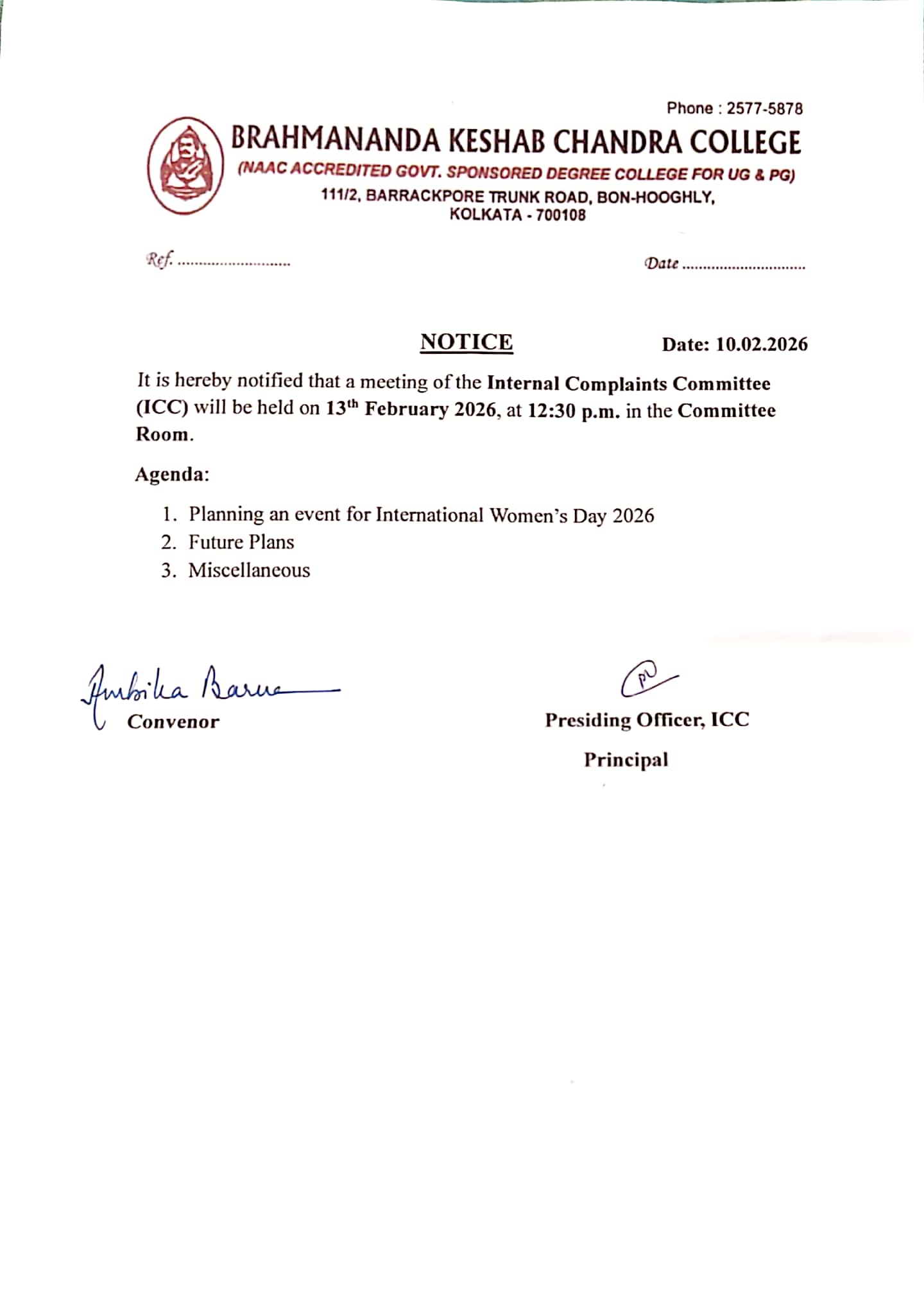 News : Notice for a meeting of the Internal Complaints Committee on 13.02.2026
