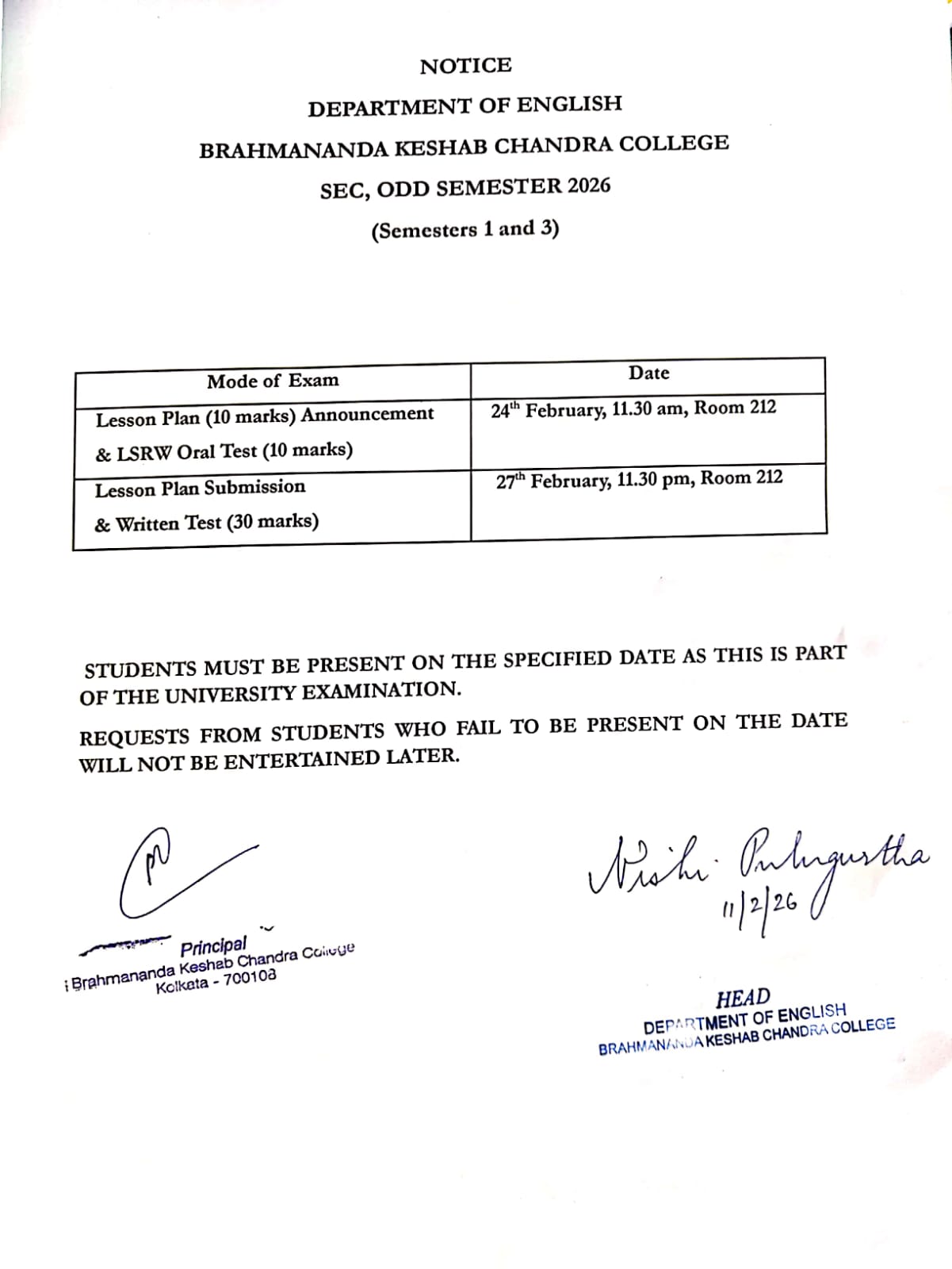 News : Notice for SEC Examination Odd Semester 2026 (Sem-I & III), Department of English