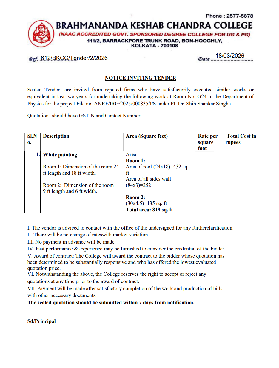 News : Notice inviting Tender for work (painting) in the Dept. of Physics dt. 18.03.2026